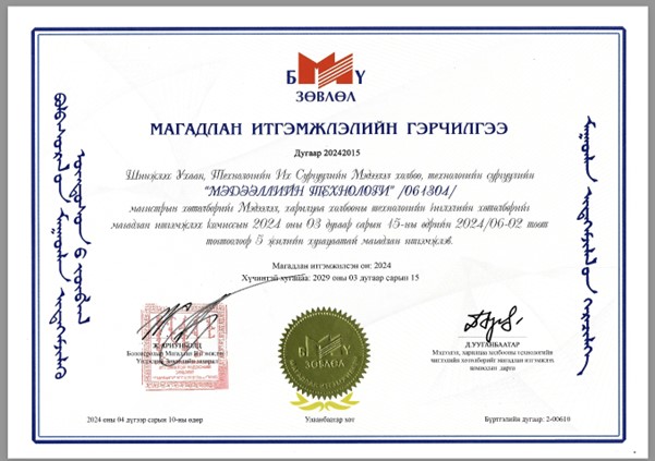 The Telecommunications Engineering Technology and Wireless Communications Engineering Technology programs of MUST's School of Information and Communication Technology became the first programs in Mongolia to be internationally accredited by the US-based ABET (Accreditation Board for Engineering and Technology) for a 6-year term.
